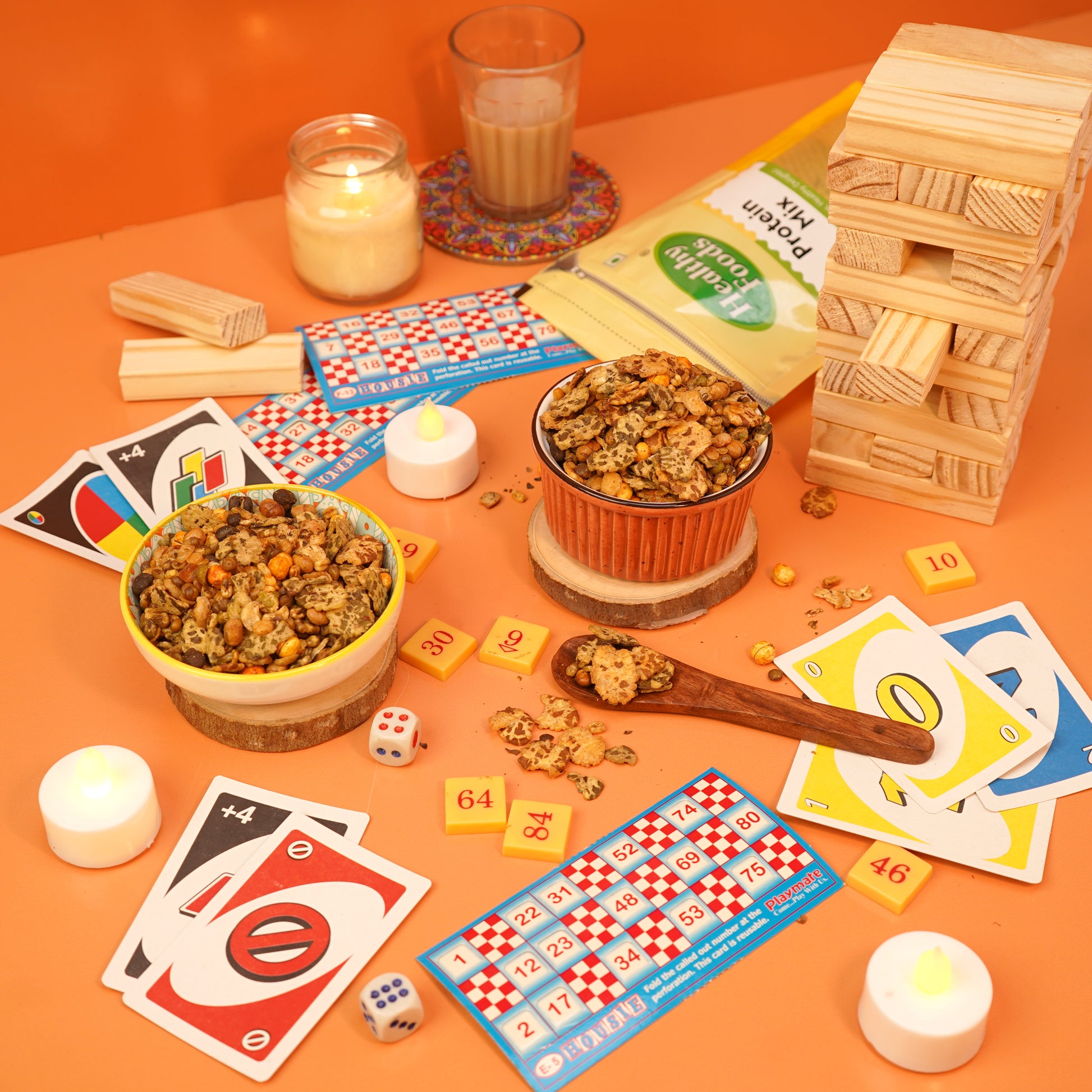 Roasted Moong, Chana, Masoor, Soy Nuts, Peanuts, Flax Seeds, Spices, Salt, Edible Oil (for seasoning)