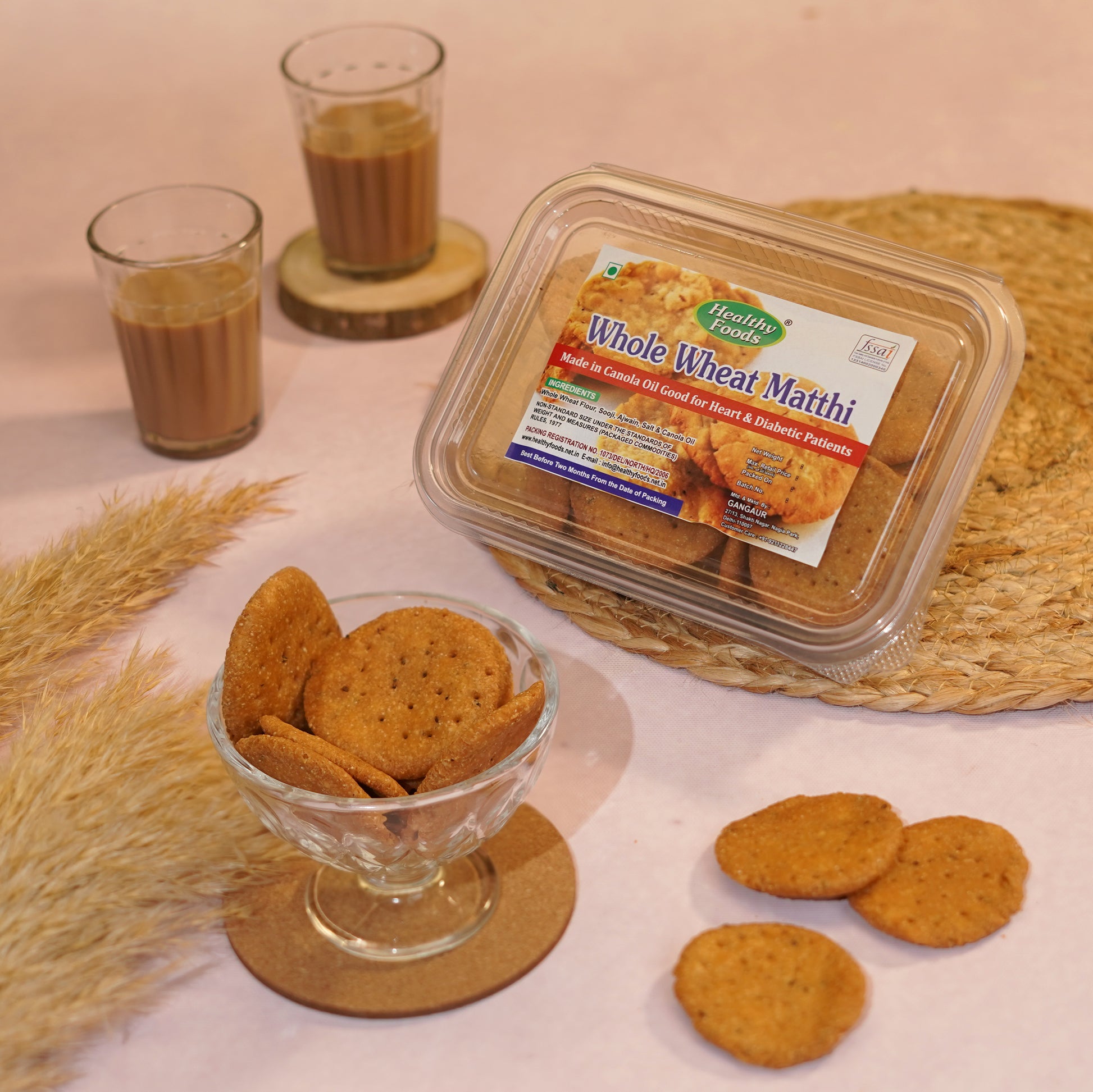 Our Whole Wheat Matthi brings back the classic matthi flavour you love — but with a wholesome twist. Made using 100% whole wheat flour, it’s richer in fibre, lighter on the stomach, and crafted with clean, mindful ingredients that make everyday snacking feel a lot better.